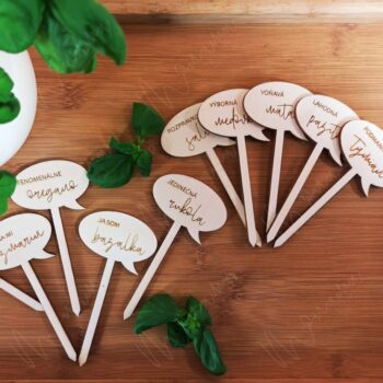 Drevené zápichy do byliniek sú vyrezávané zo 4 mm hrubej preglejky.