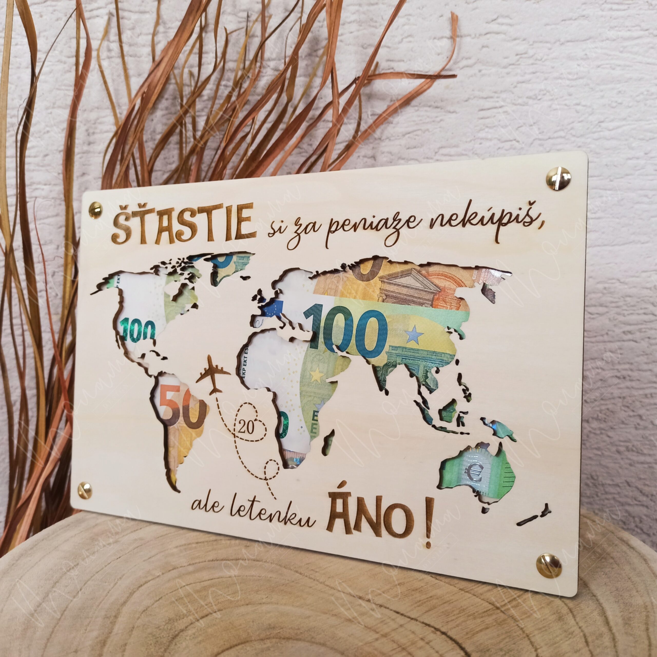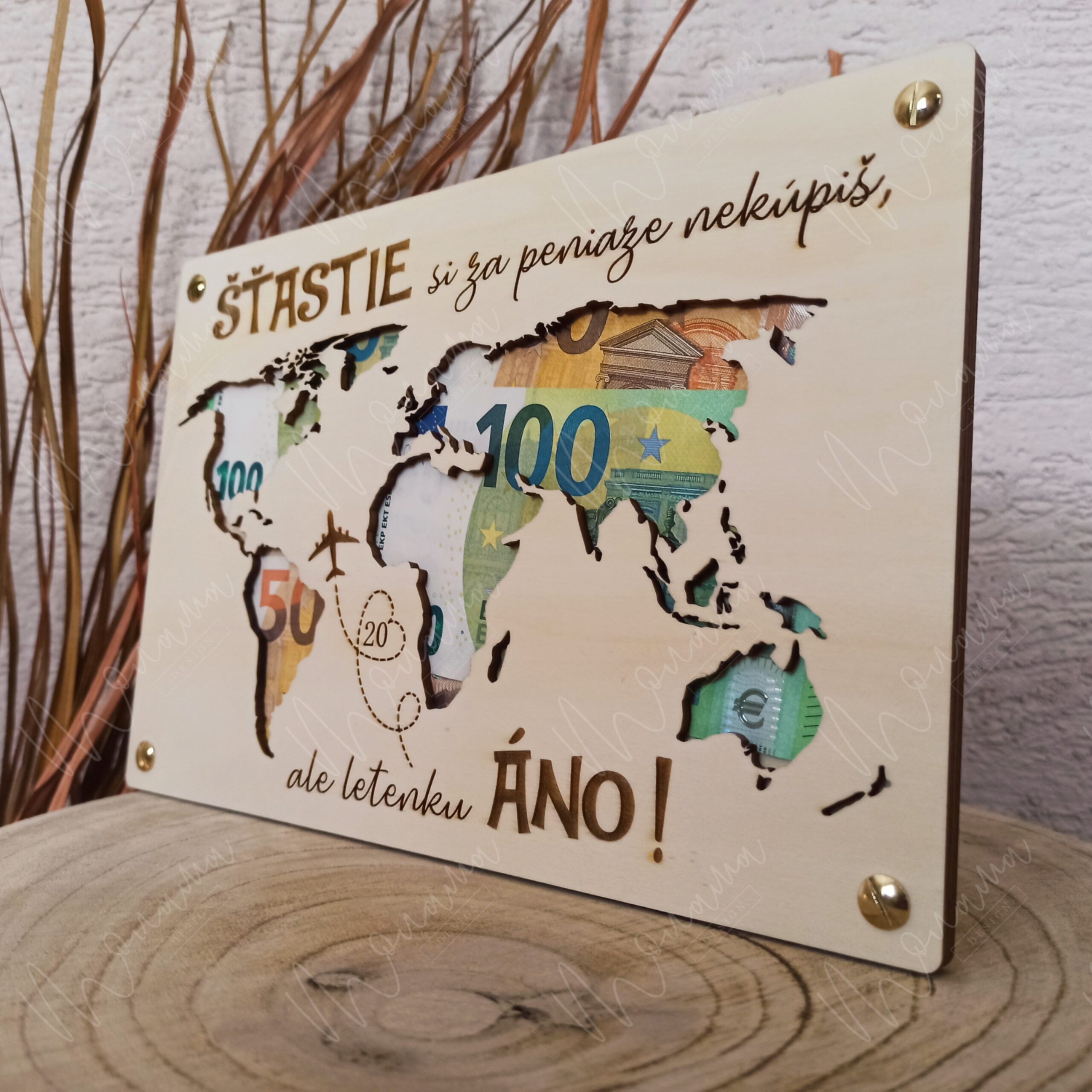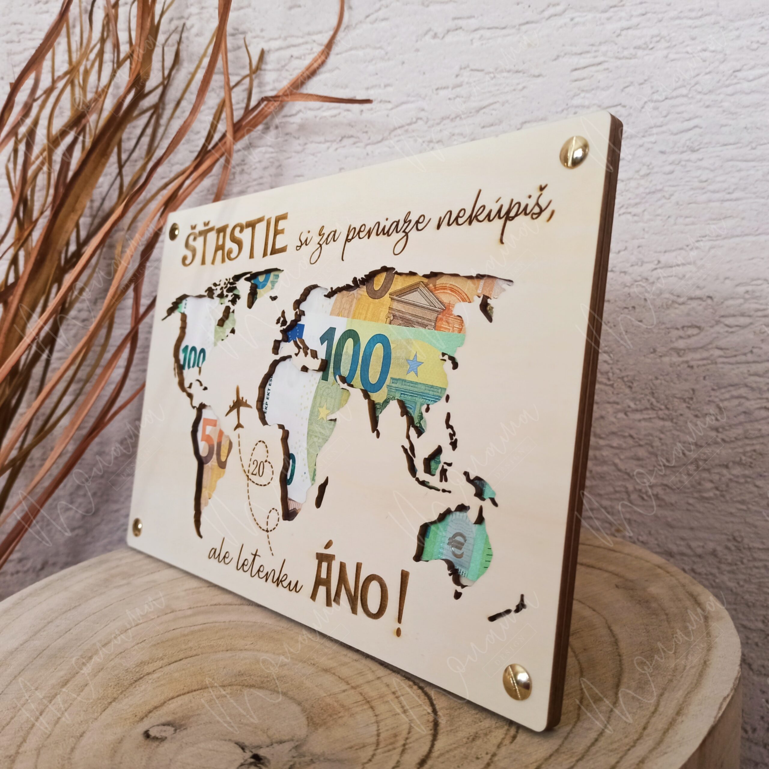Drevená tabuľa na peniaze - Svet - je vyrezávaná zo 4 mm hrubej preglejky. Doplnená o drevené uchytenie na peniaze so štyrmi zlatými skrutkami.