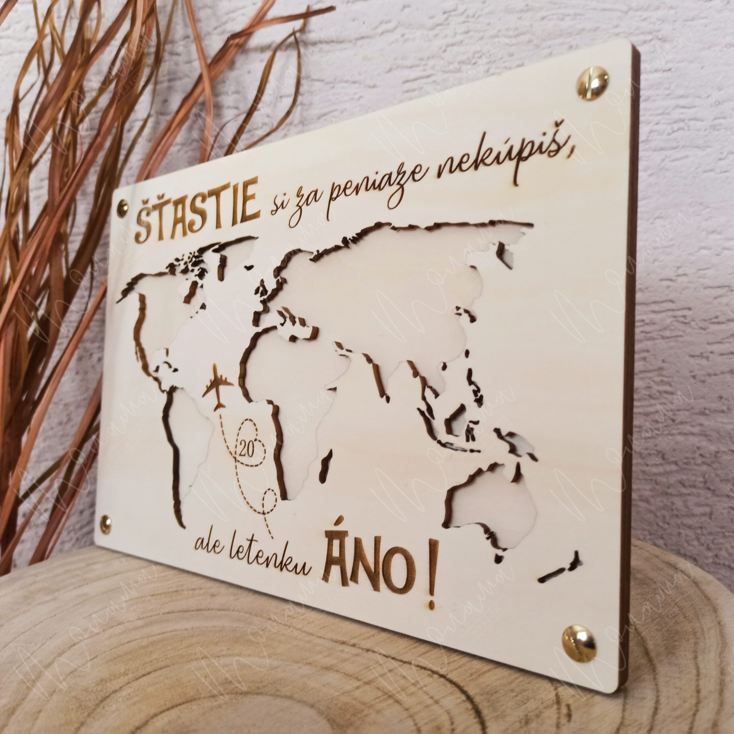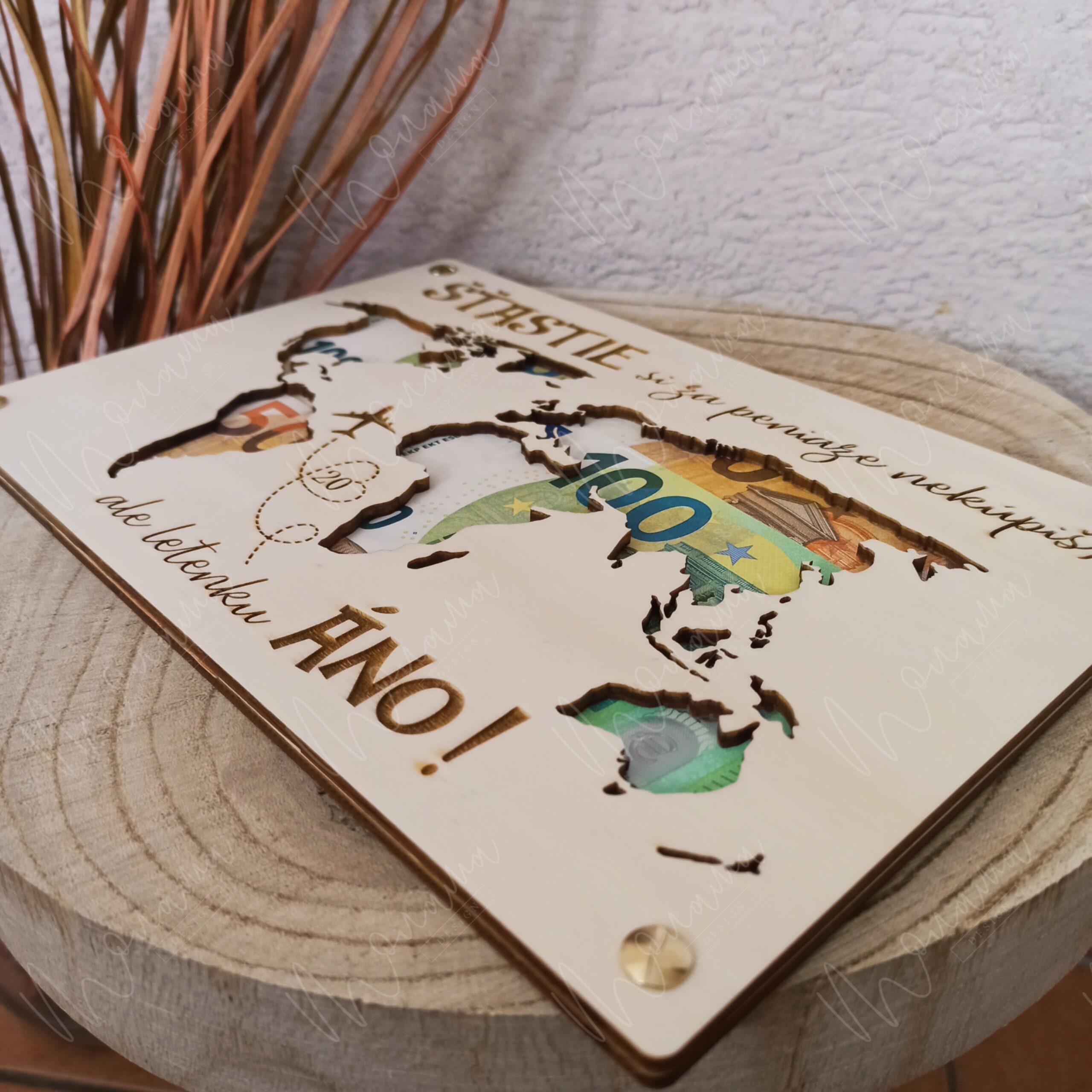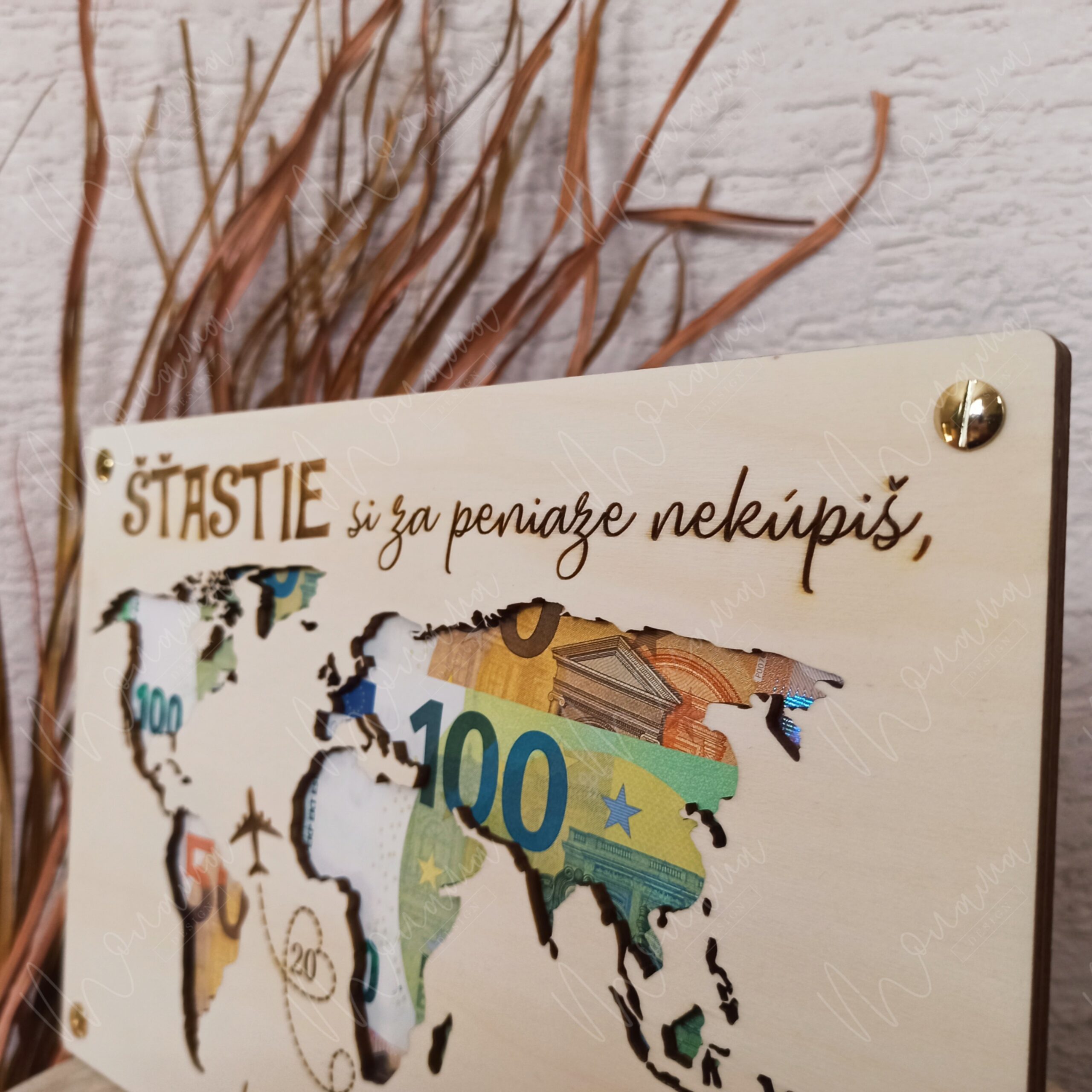 Drevená tabuľa na peniaze - Svet - je vyrezávaná zo 4 mm hrubej preglejky. Doplnená o drevené uchytenie na peniaze so štyrmi zlatými skrutkami.