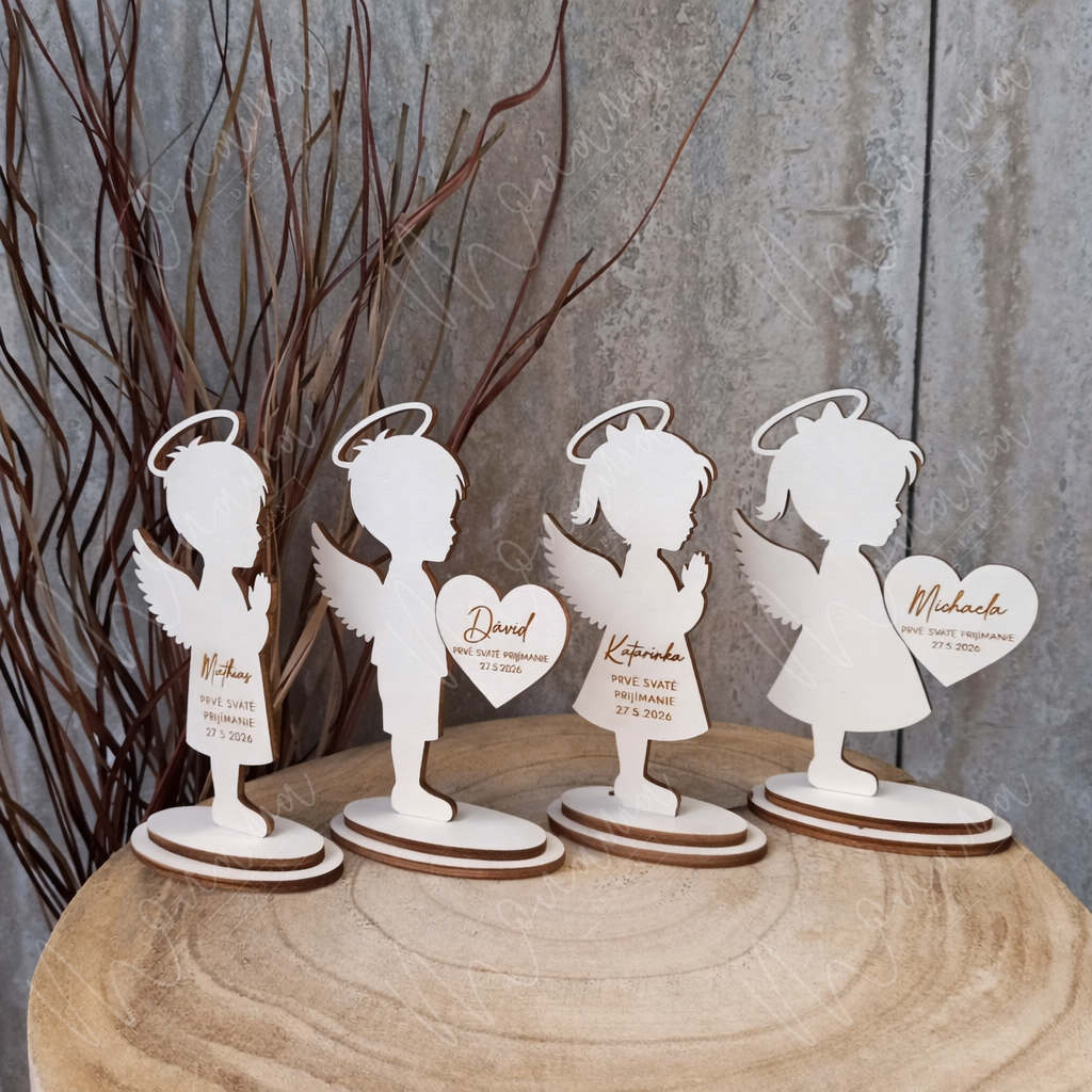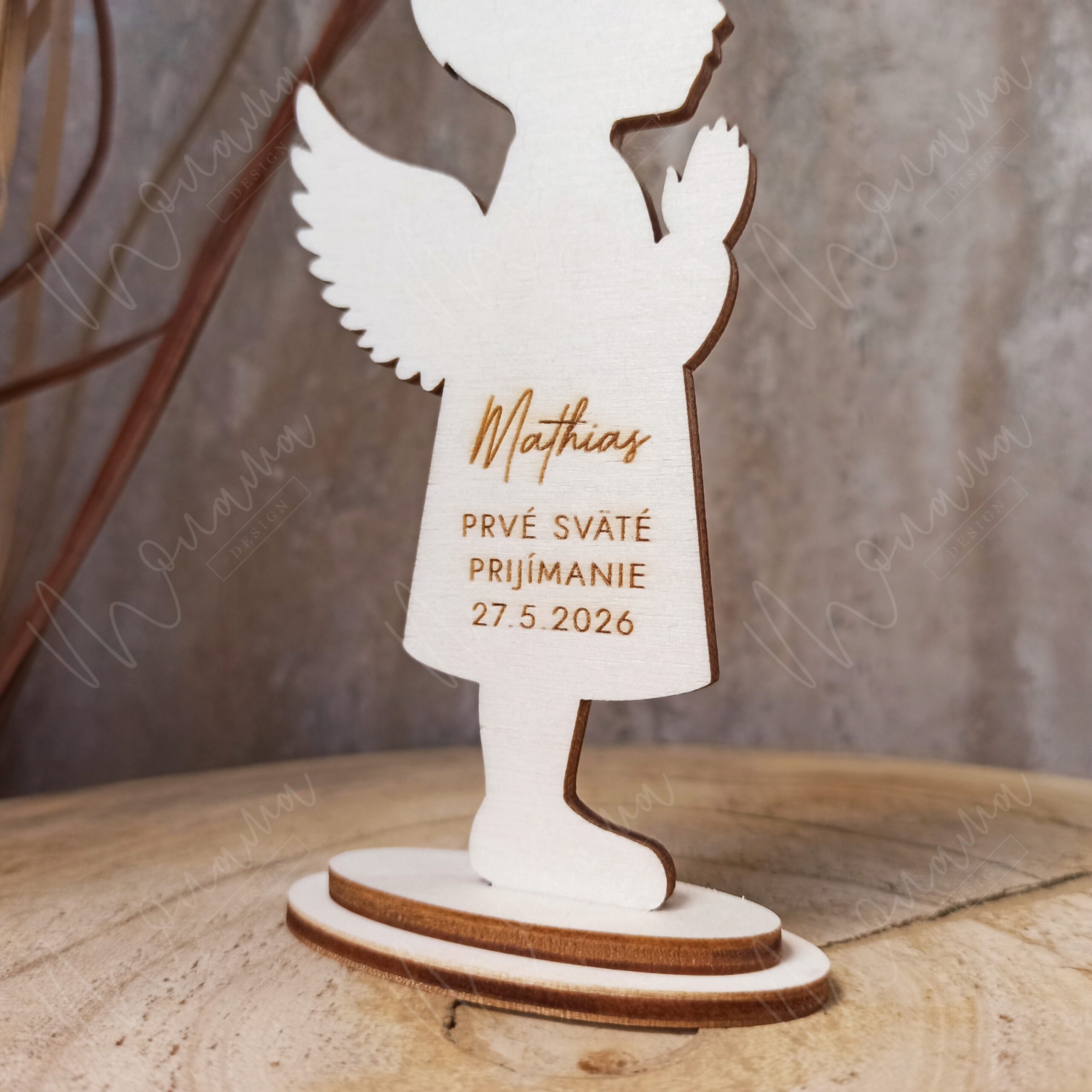 Pamiatka na Prvé sväté prijímanie v podobe dreveného anjelika na stojane je krásny symbolický darček. S menom a dátumom vytvorí osobnú spomienku, ktorá zostane dieťaťu na celý život.