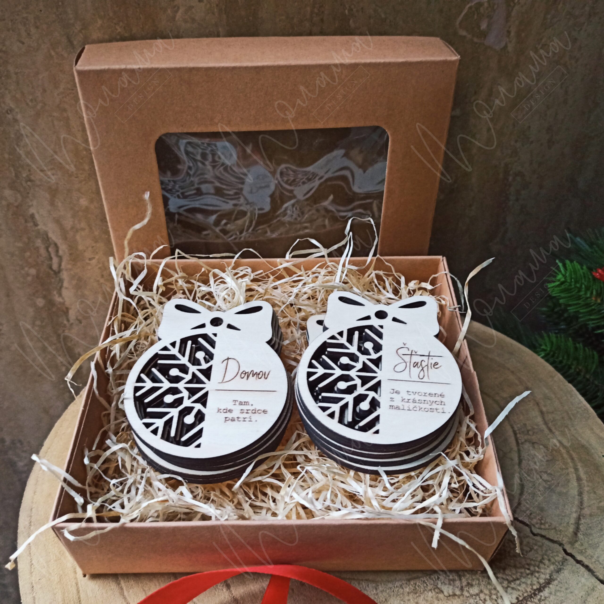 Drevené vianočné ozdoby s citátom – sada elegantných ozdôb s vločkami a motivačnými slovami, ktoré dodajú stromčeku teplo a zmysel.