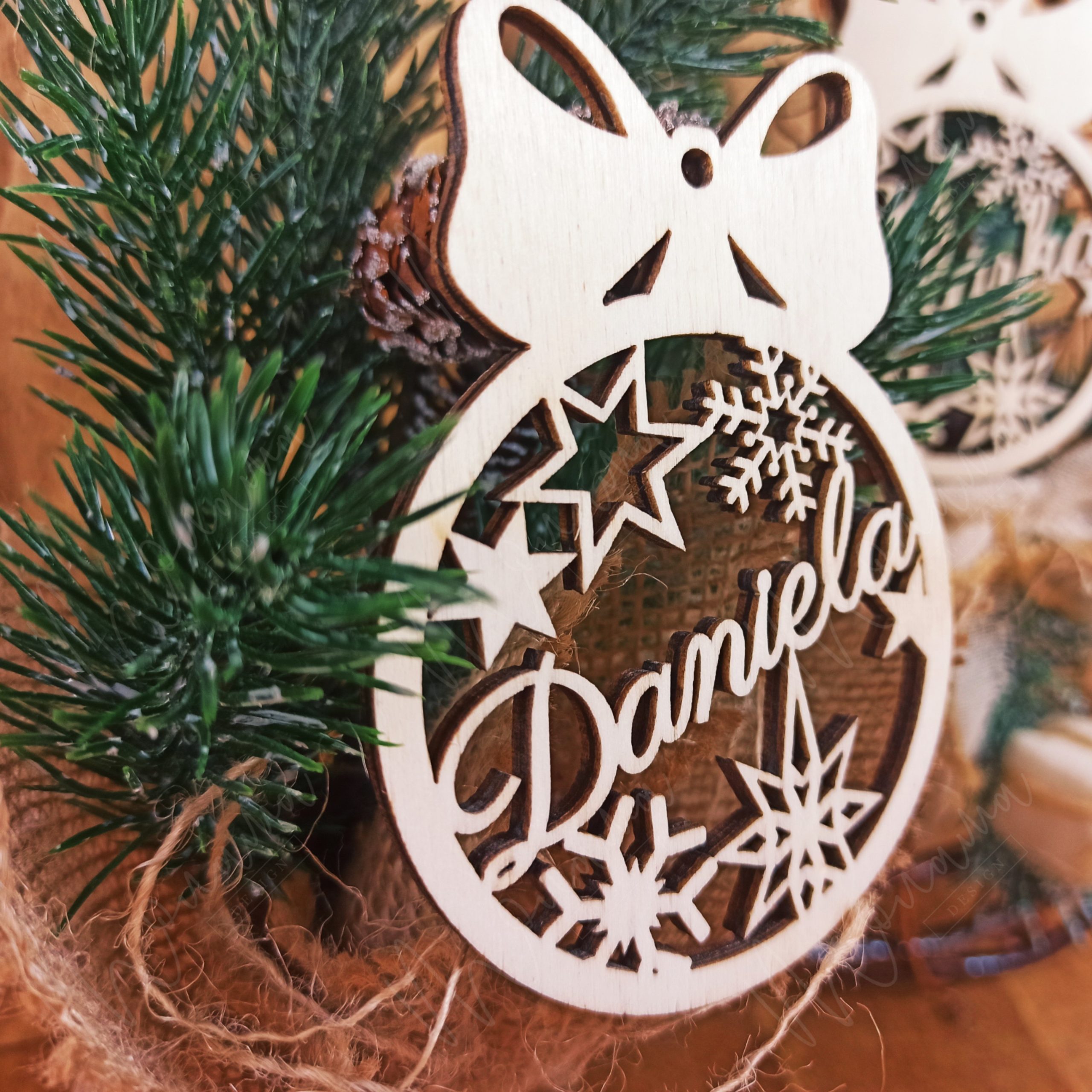 Vianočná ozdoba s Vašim menom. Ozdoba je vyrezávaná zo 4 mm hrubej preglejky s tvarom vianočnej gule s mašľou s kvalitným prevedením a dostatočnou hrúbkou proti polámaniu.
